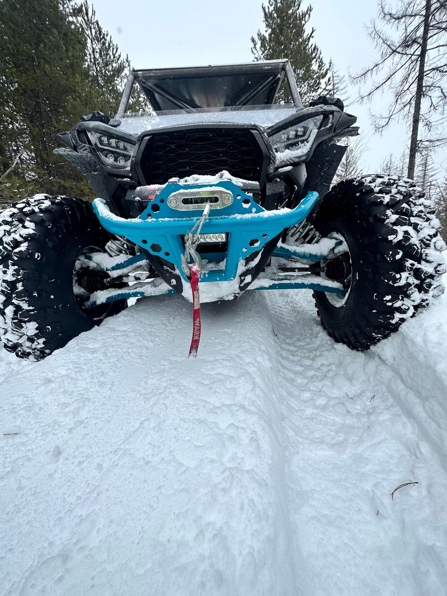 KRX-1000 Front bumper with winch mount and 6inch led light bar. Built with 3/16 plate and 1.75 steel tubing. Fully welded in all the right places for high strength bumper for all your winching and pulling needs.